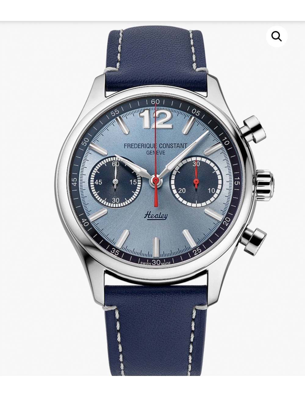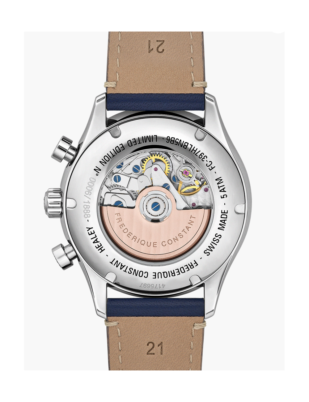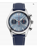 Limitato a 1.888 esemplari, questo cronografo sportivo si presenta con una cassa in acciaio da 42 mm e un fondello aperto. montato su un cinturino in pelle di vitello blu marine con impunture a contrasto, il modello si caratterizza per un design duale: due colori (blu sole sul quadrante e blu marine sul réhaut), due contatori (piccoli secondi a ore 9 e 30 minuti a ore 3) e due pulsanti, che ne sottolineano il carattere deciso.