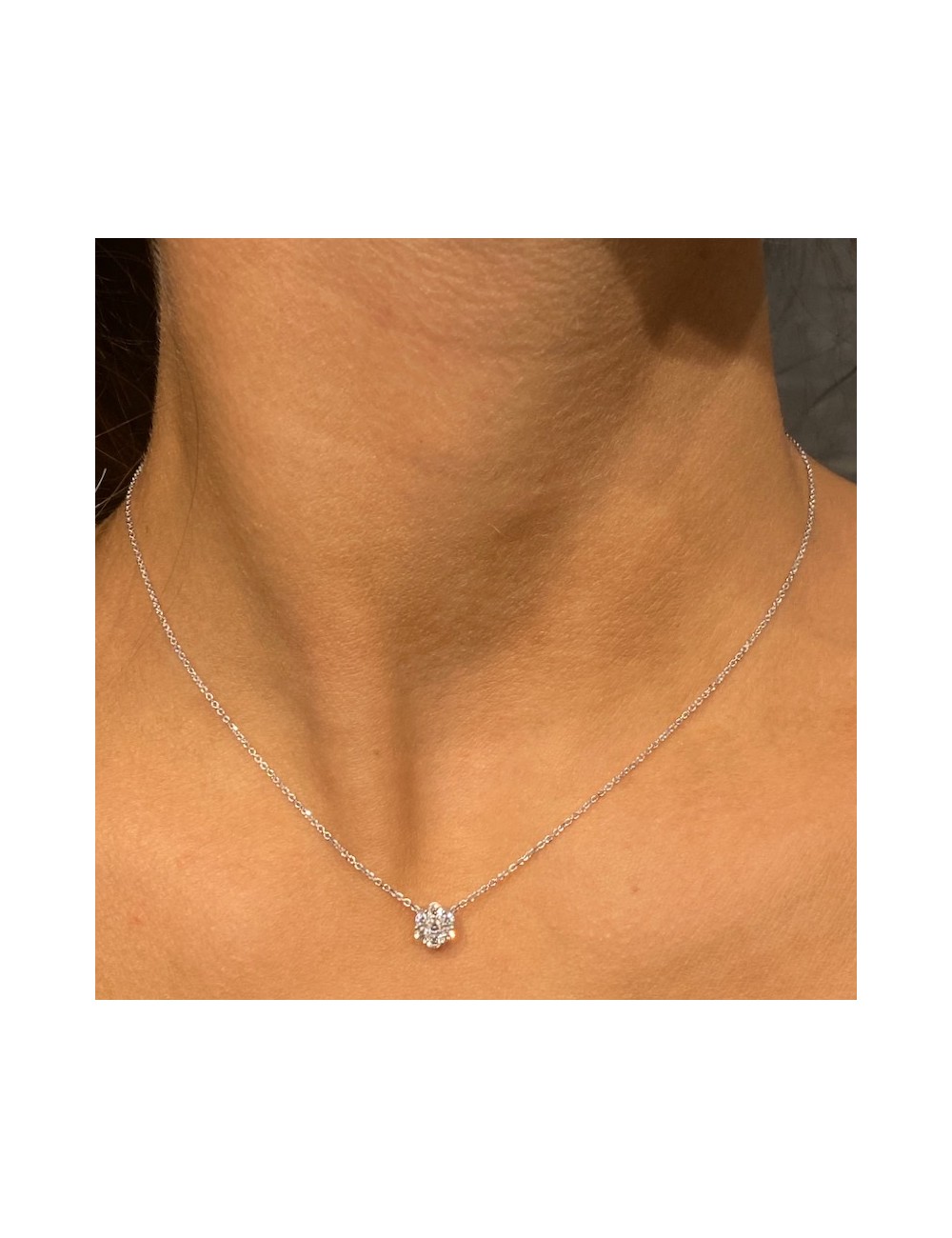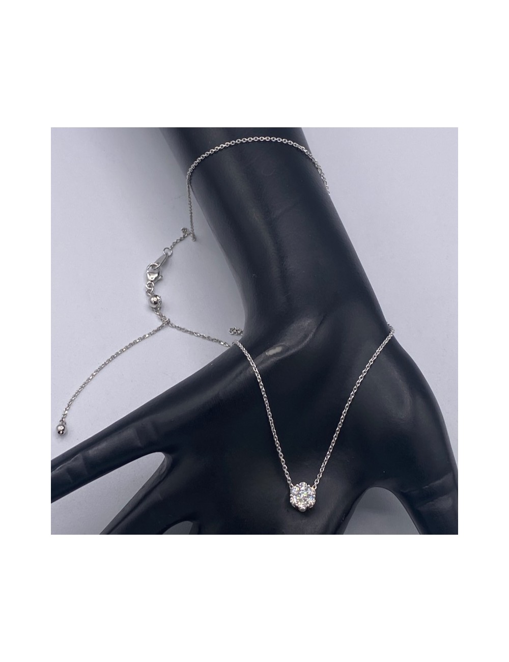 Girocollino in oro bianco con catena maglia "rolò" piccola regolabile in base alla lunghezza preferita dal cliente tramite uno "stopper" brevettato.