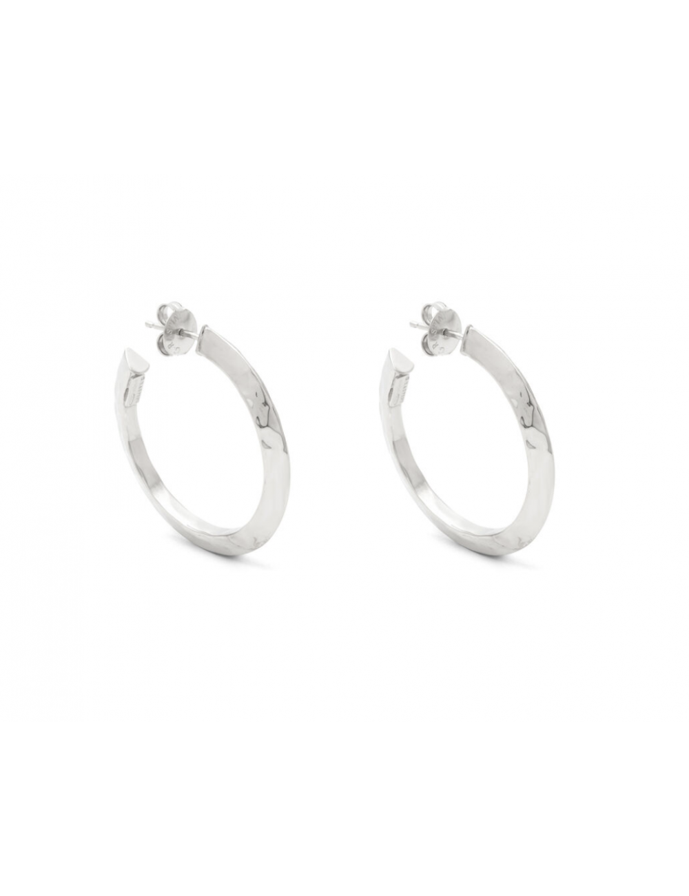 Questi orecchini a cerchio, dalla sezione triangolare e con una texture che riflette una luce intensa, sono parte della collezione Blade. Ogni gioiello è progettato per un look deciso e rock, realizzato in azienda con una lastra d'argento martellata a mano.