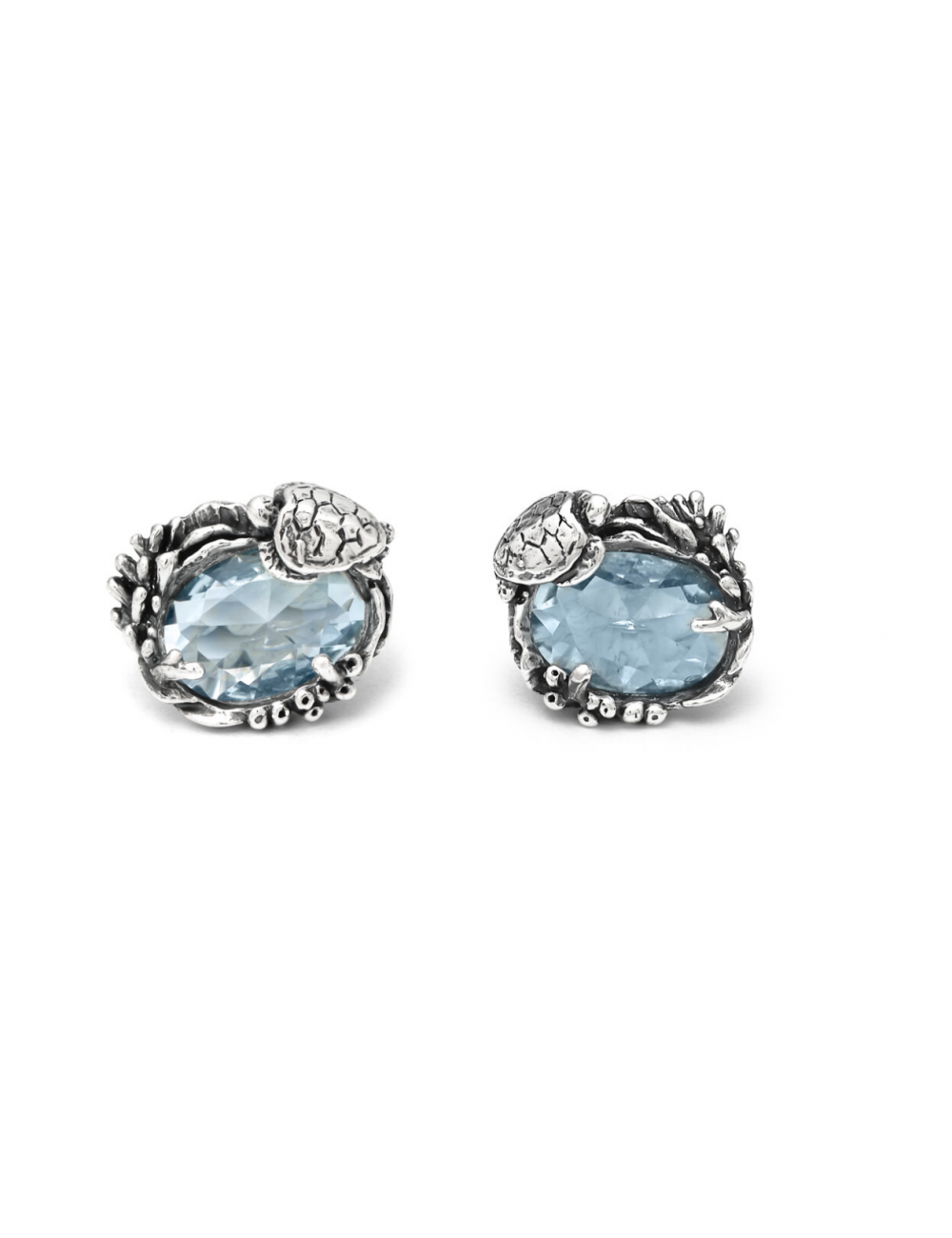 Realizzati completamente a mano, in argento brunito, questi orecchini testimoniano tutto l'amore di Giovanni Raspini per il mondo marino, mettendo insieme tradizione e bellezza. L'argento, fuso a cera persa, incontra la delicatezza coloristica del quarzo color azzurro acquamarina. Fatti completamente a mano.