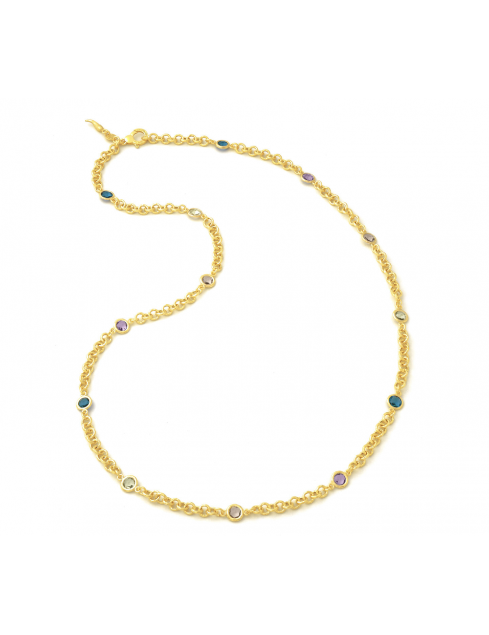 Una collana luminosissima, vivace ed elegante, lunga 94 centimetri, che alterna una catena martellata in argento dorato con tredici cristalli colorati: quattro azzurri, tre verde lime, tre color cipria e tre color glicine. Le gemme, a giorno con taglio rotondo, sono incastonate da una fascetta sempre in argento dorato.