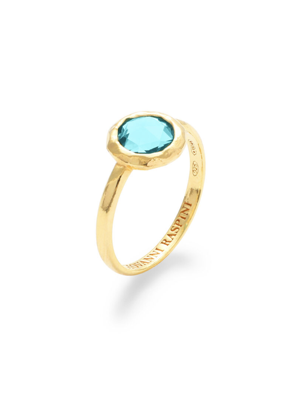 Un anello elegante e minimal, bellissimo nella sua perfetta semplicità. In argento dorato, monta un cristallo a giorno color azzurro, con taglio rotondo, incastonato da una fascetta martellata. Realizzato a mano in azienda.