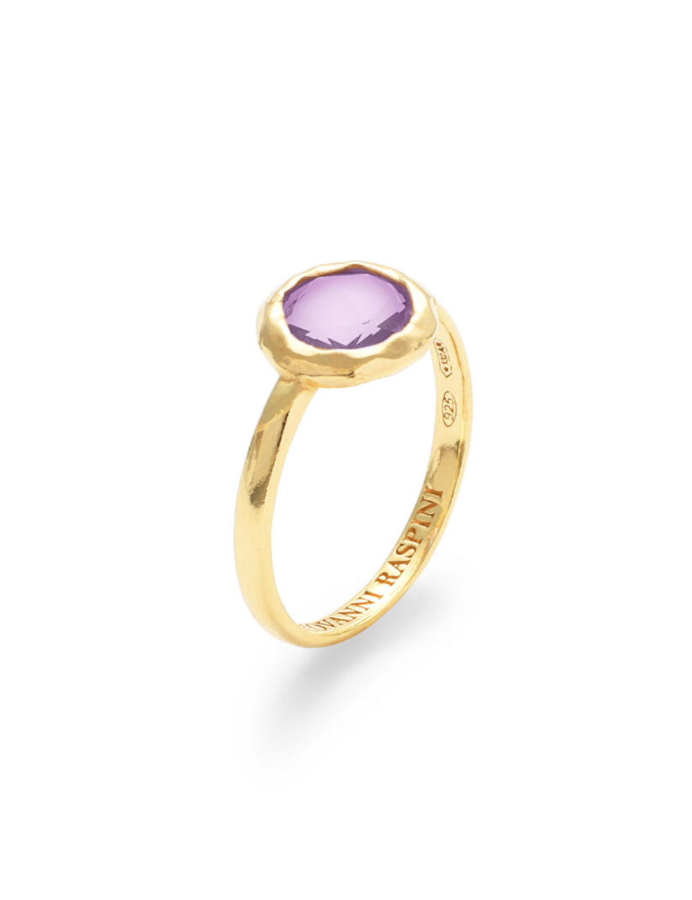 Un anello elegante e minimal, bellissimo nella sua perfetta semplicità. In argento dorato, monta un cristallo a giorno color glicine, con taglio rotondo, incastonato da una fascetta martellata sempre in argento dorato. Realizzato a mano in azienda.