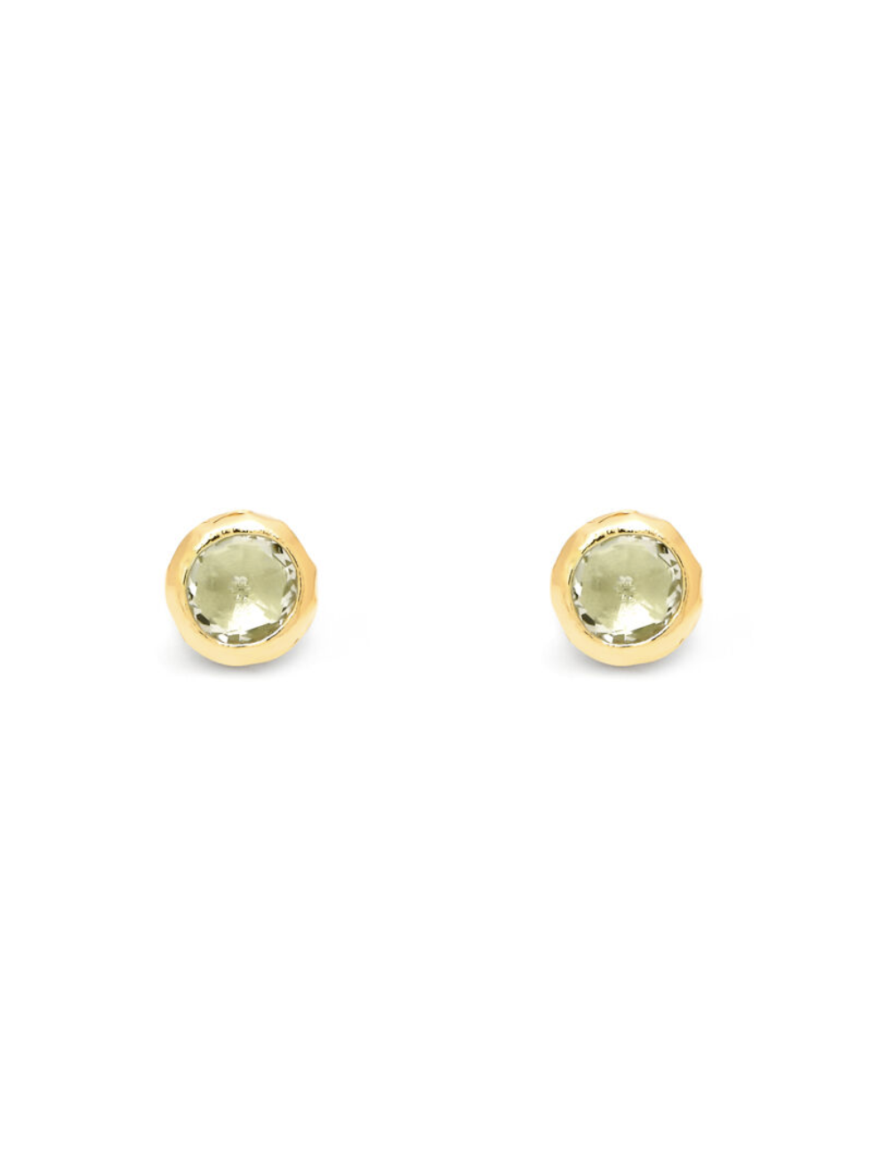 Bellissimi nella loro semplicità, questi piccoli orecchini a bottone in argento dorato, montano due cristalli verde lime, con taglio rotondo, incastonati da una fascetta elegante e minimal. Realizzati a mano in azienda.