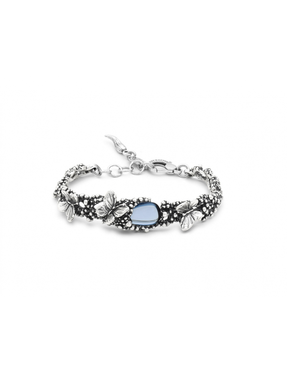 Il bracciale Goccia Farfalle racconta l’incontro tra leggerezza e raffinatezza. Il decoro in argento, realizzato con la tecnica della fusione a cera persa, raffigura delicate farfalle immerse nel loro habitat naturale, in dialogo con un cristallo blu ciano, elemento di luce e colore che dona profondità e armonia. Completa il gioiello una delicata catena in argento. Interamente fatto a mano in azienda.