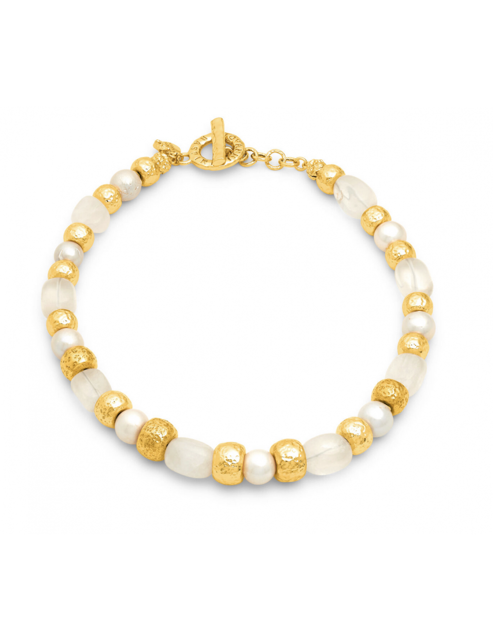 Raffinata e luminosa collana che propone il dialogo fra elementi in bronzo martellato dorato, perle naturali d'acqua dolce e segmenti in cristallo di rocca. Munita di comoda chisura a T - bar con medesima finitura martellata. Tutto il fascino della fusione a cera persa per un gioiello realizzato completamente a mano in azienda.