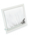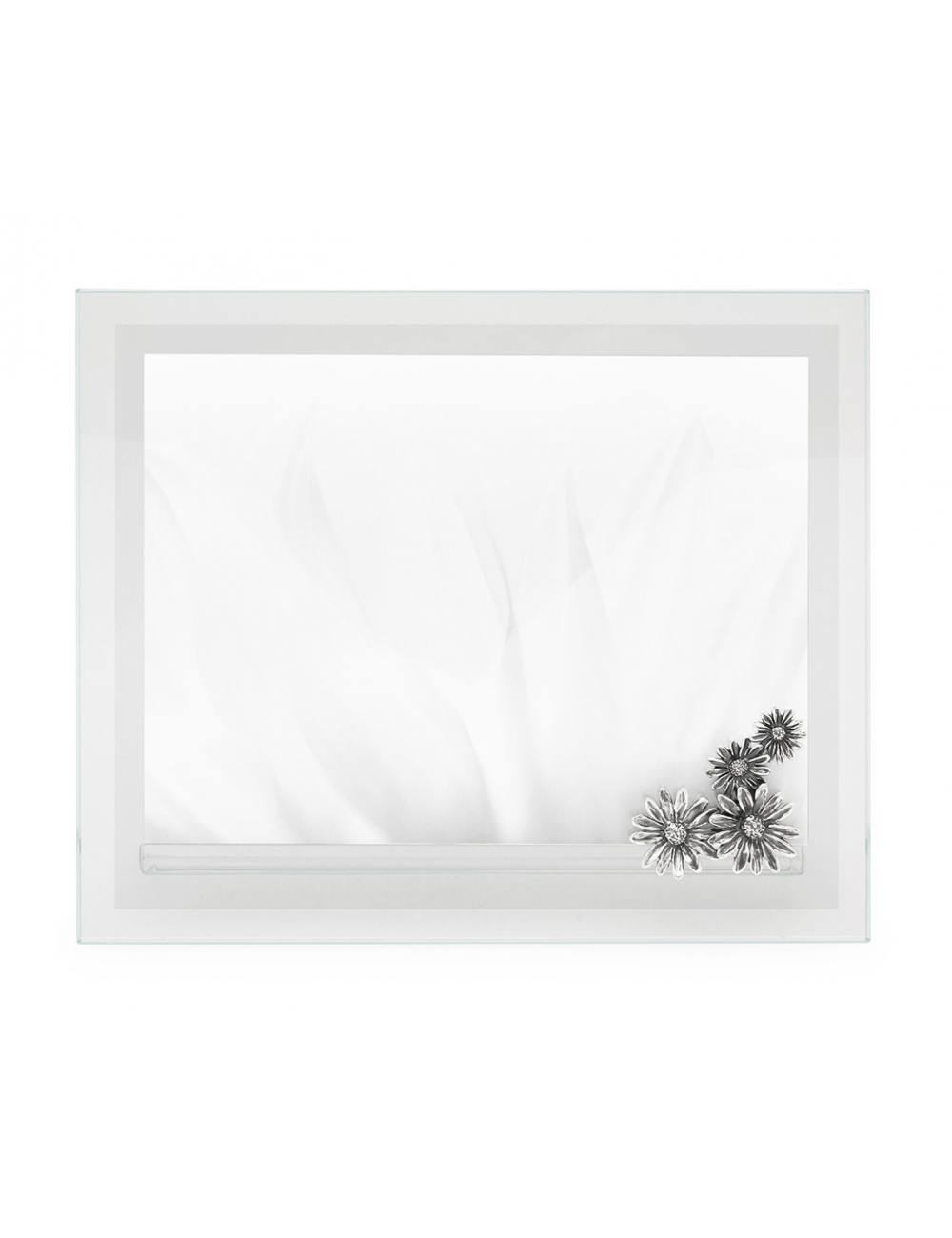 Un bellissimo decoro di margherite in argento, fiore evergreen di Giovanni Raspini, rende unica questa cornice caratterizzata dalla grande luminosità dei bordi in vetro trasparente. Le quattro margherite, poste con eleganza sul lato inferiore sinistro, sono realizzate a mano con l'antica tecnica della fusione a cera persa e successiva brunitura.