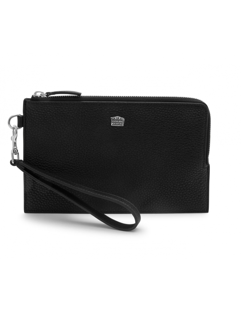 Realizzato in pregiata pelle nera di vitello goffrata, questa pouch è il modello più grande della collezione, versatile e ideale per chi desidera spazio senza rinunciare allo stile. La pouch, dotata di un comodo laccio da polso staccabile in pelle e metallo, si chiude con una robusta cerniera, la quale garantisce che tutti gli oggetti contenuti siano al sicuro. All'interno è presente un unico grande scomparto, munito di 3 tasche aggiuntive per carte di credito. Questo prodotto rappresenta la massima eccellenza artigianale che da sempre contraddistingue il brand Giovanni Raspini, ed è impreziosito da un caratteristico elemento in Argento 925, realizzato in fusione a cera persa e raffigurante il logo del brand in miniatura, sovrastato dall'iconico coccodrillo. Lavorato interamente a mano in Toscana.