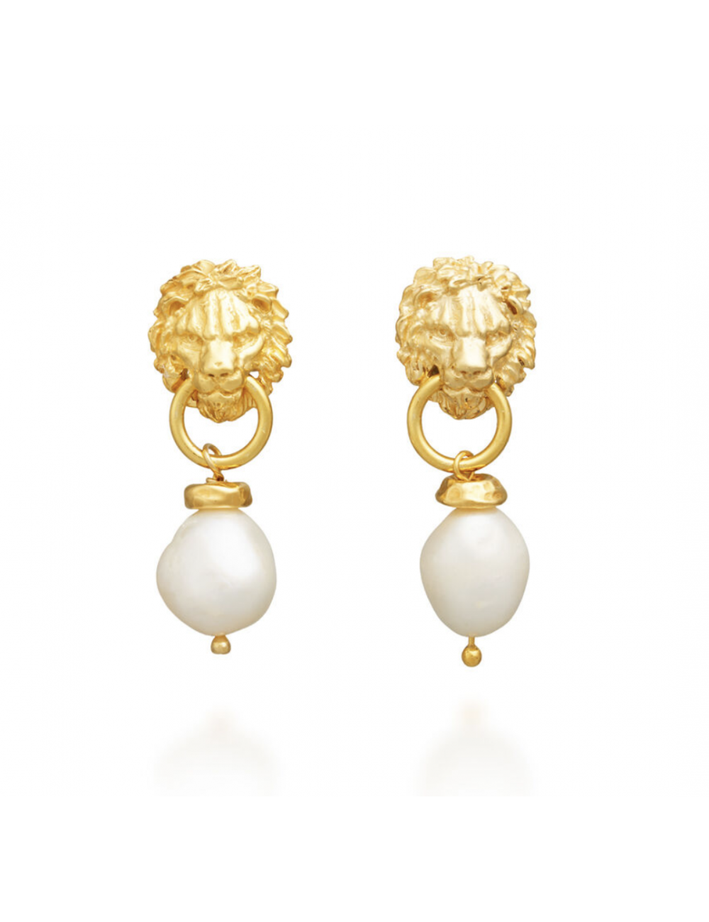 I nostri orecchini, realizzati interamente a mano in azienda, regalano eleganza, colore e gioia. Le teste di leone, fuse a cera persa nell'argento e quindi dorate, sostengono due luminosissime perle barocche d'acqua dolce.