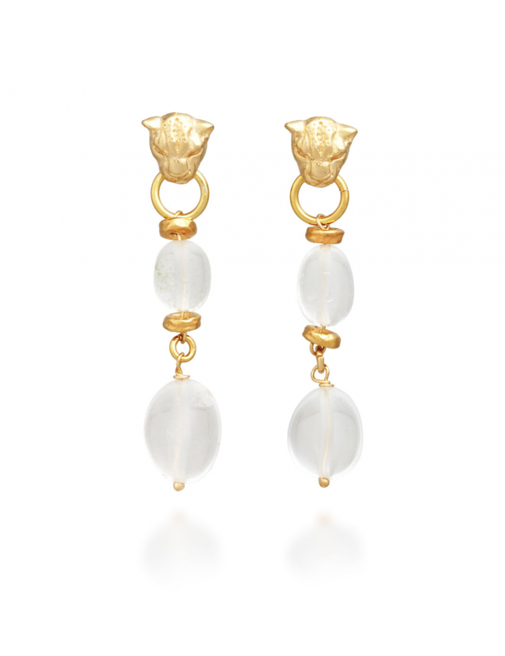 Orecchini contemporanei nella loro classicità. Due teste di leopardo, fuse in argento a cera persa e quindi dorate, sostengono ognuna due elementi in cristallo di rocca.
