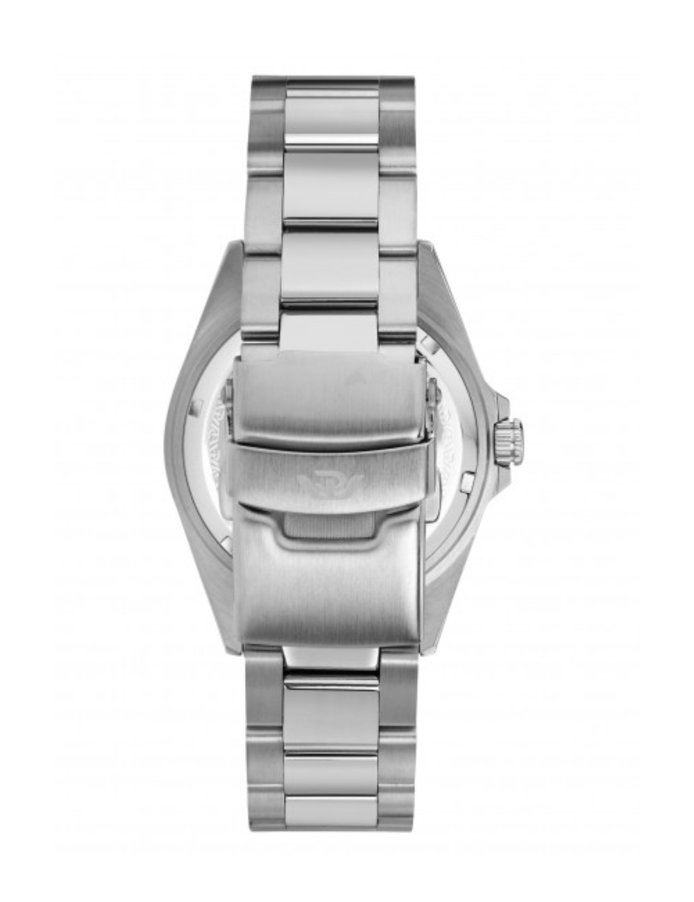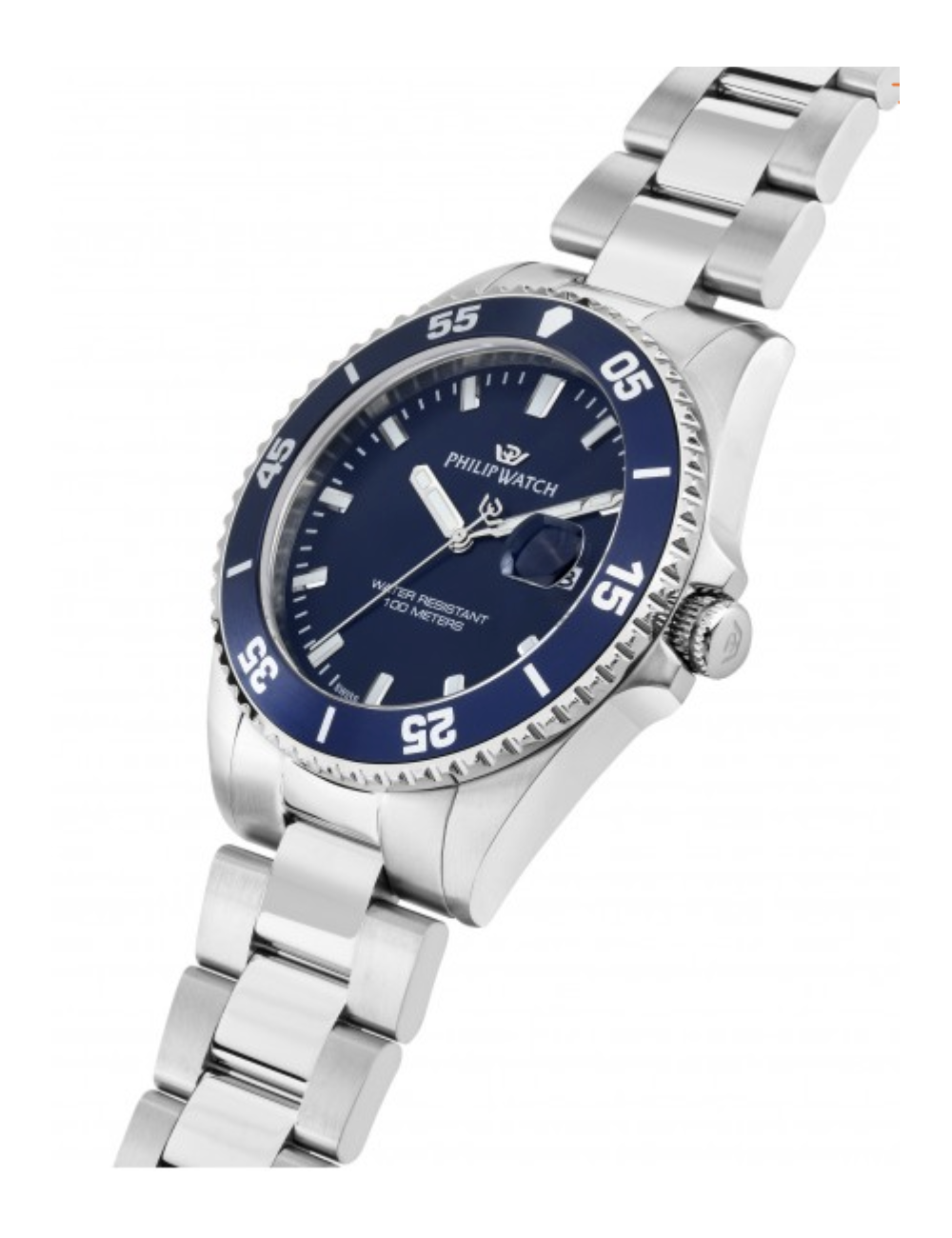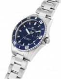 Cassa in acciaio inox dal diametro di 42 mm. Lunetta in alluminio blu.