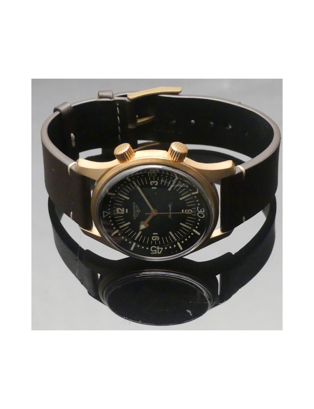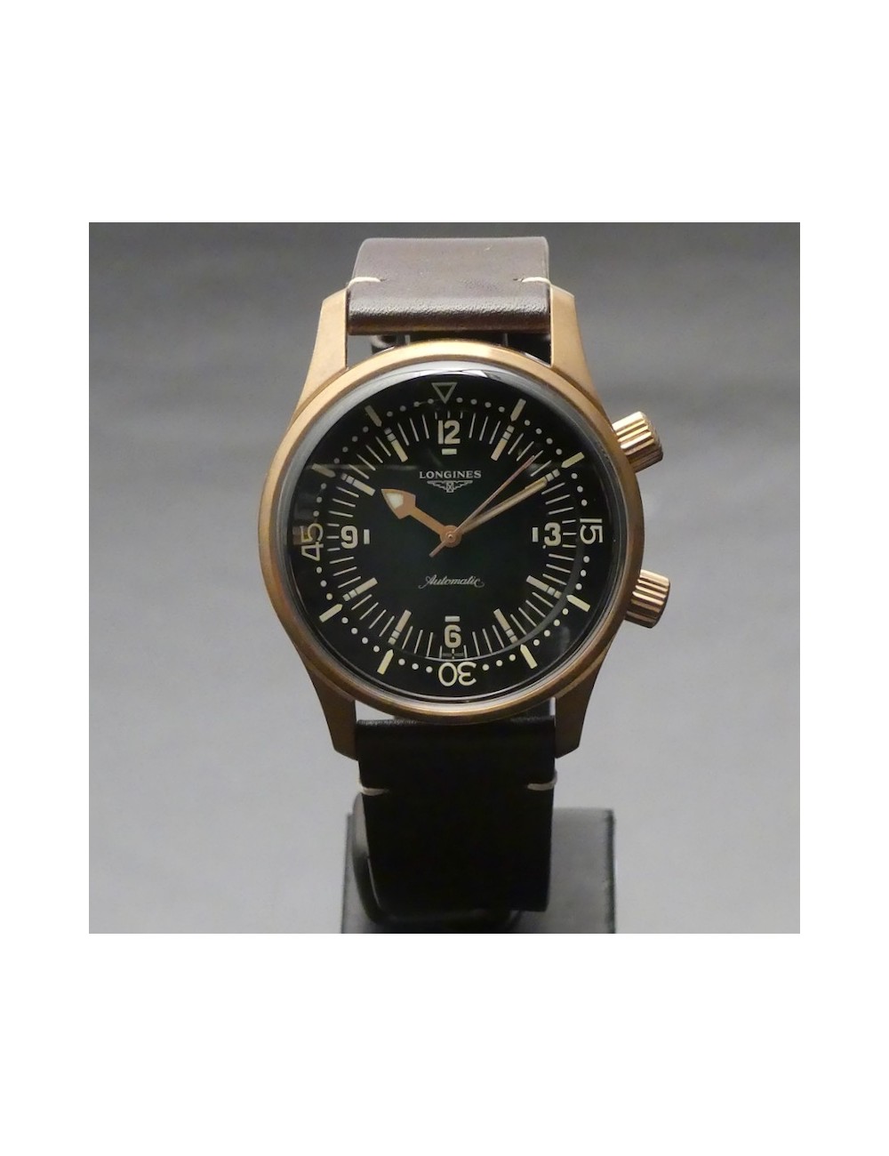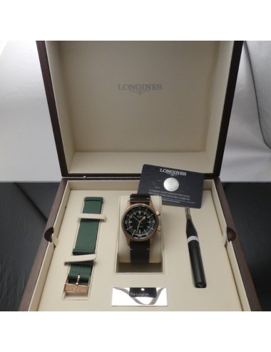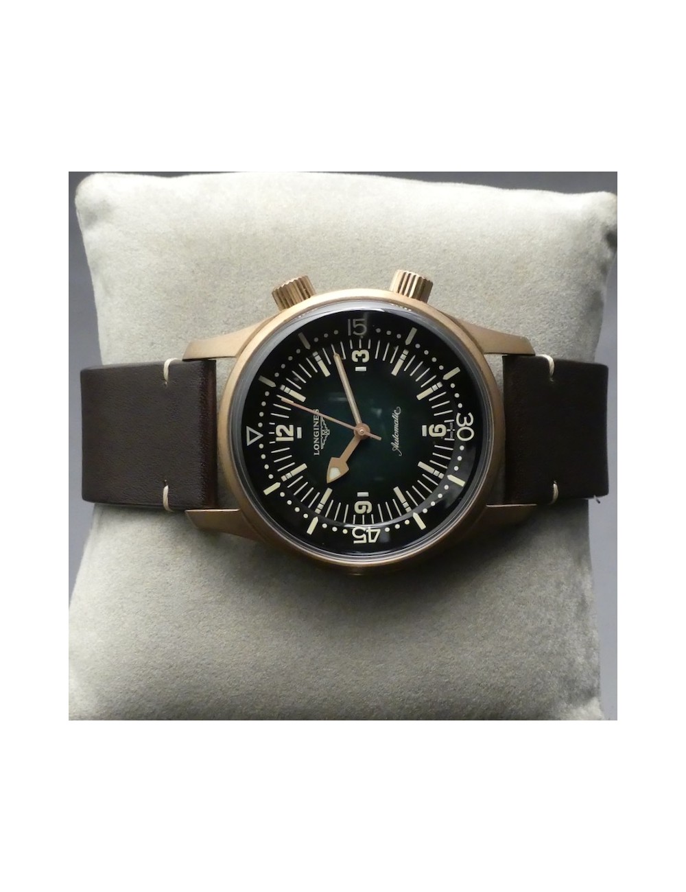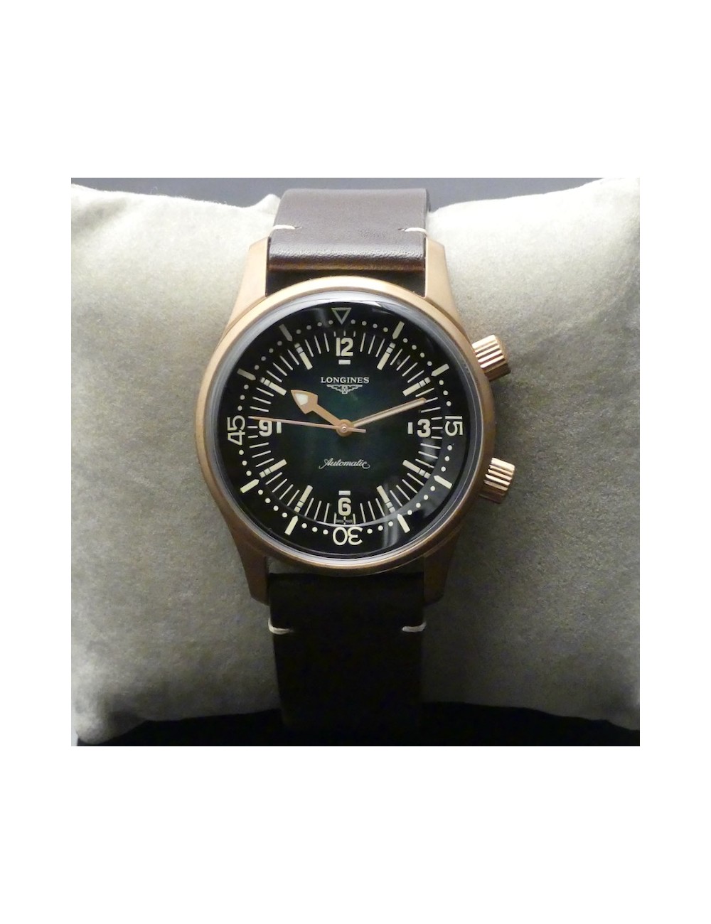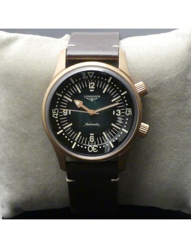 Longines Legend Diver Watch versione bronze con secondo cinturino in nylon verde di tipo NATO e uno strumento per una facile e veloce sostituzione dei cinturini.