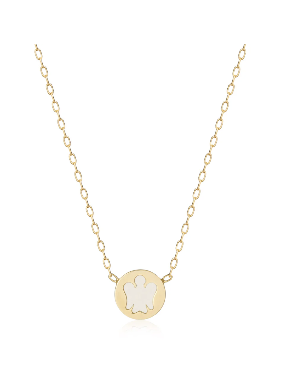Realizzata con madreperla naturale e oro 750/°°°, questa splendida collana presenta un intricato disegno dell'angelo traforato come suo elemento centrale. L'angelo simboleggia protezione e grazia, mentre la madreperla aggiunge un tocco di eleganza senza tempo al tuo look, portando con sé un senso di serenità e bellezza.
