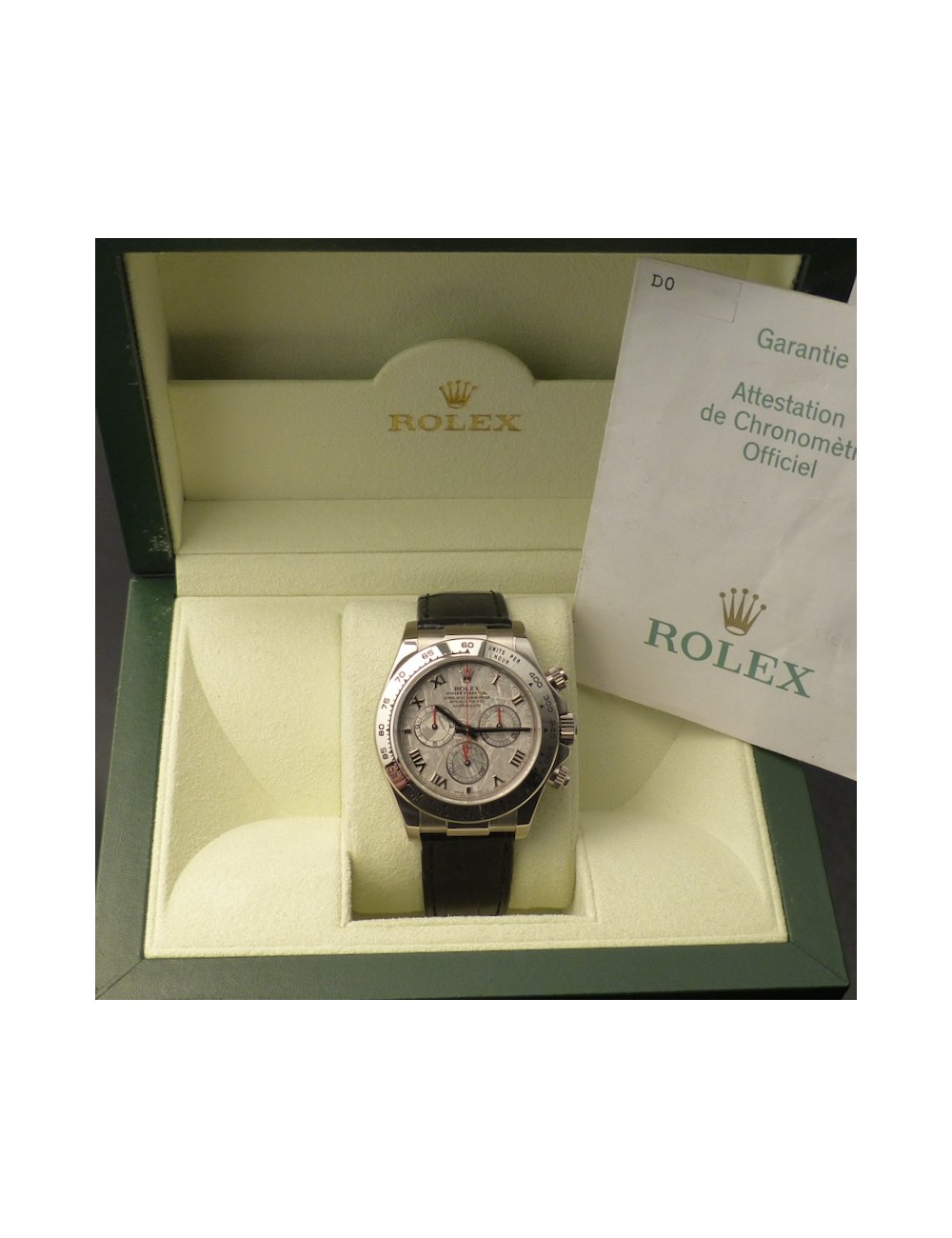 Referenza 116519,seriale D,anno 2005.Condizioni eccezionali con ancora il bollino verde nel retrocassa e pochissimo indossato dall'unico proprietario Italiano.Completamente coevo con quadrante Meteorite Swiss Made,clasp ref.24650 con codice anno di produzione CL(2004).