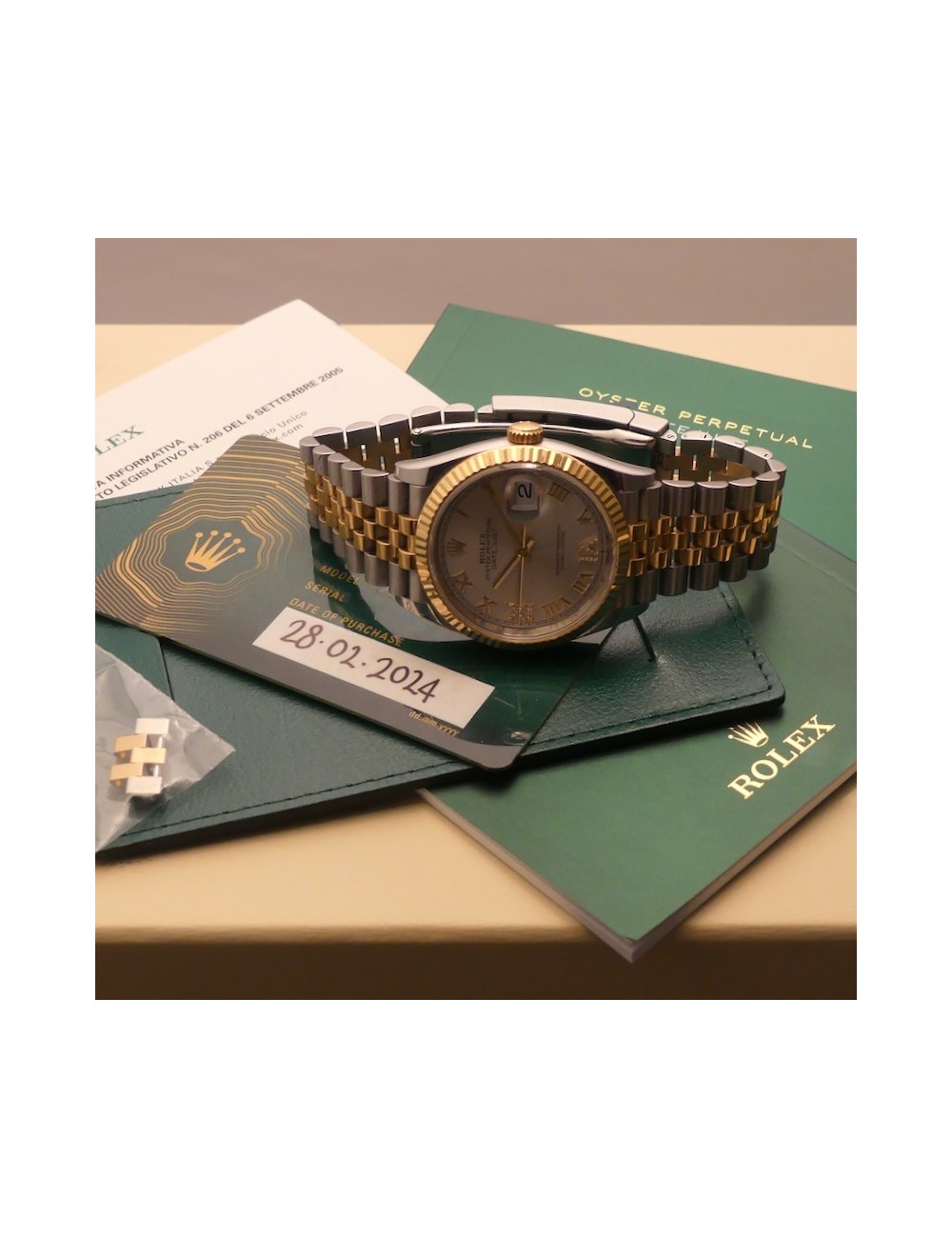 Corredo naturalmente completissimo con scatola,controscatola,nuova garanzia Rolex card 5 anni(datata 28.02.2024),portagaranzia,libricini vari e maglie complete del cinturino.